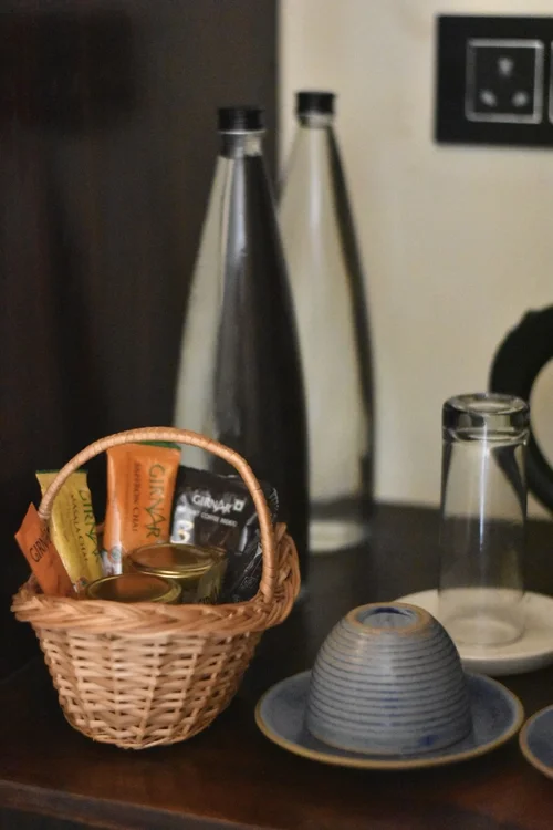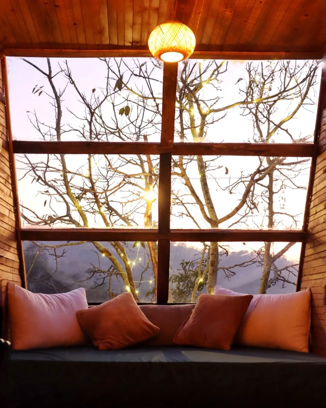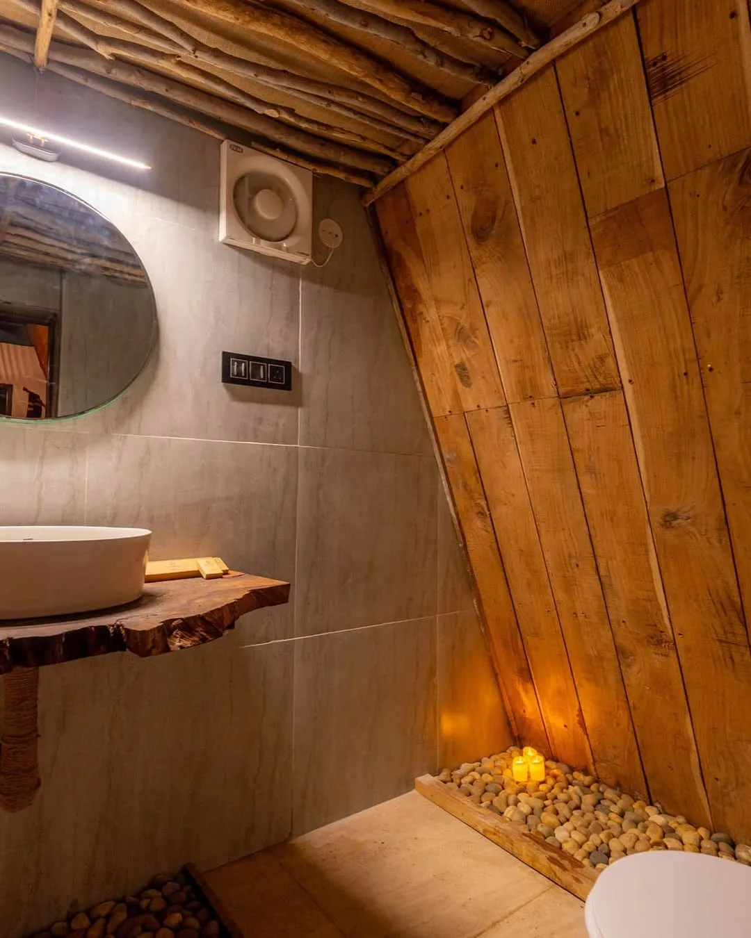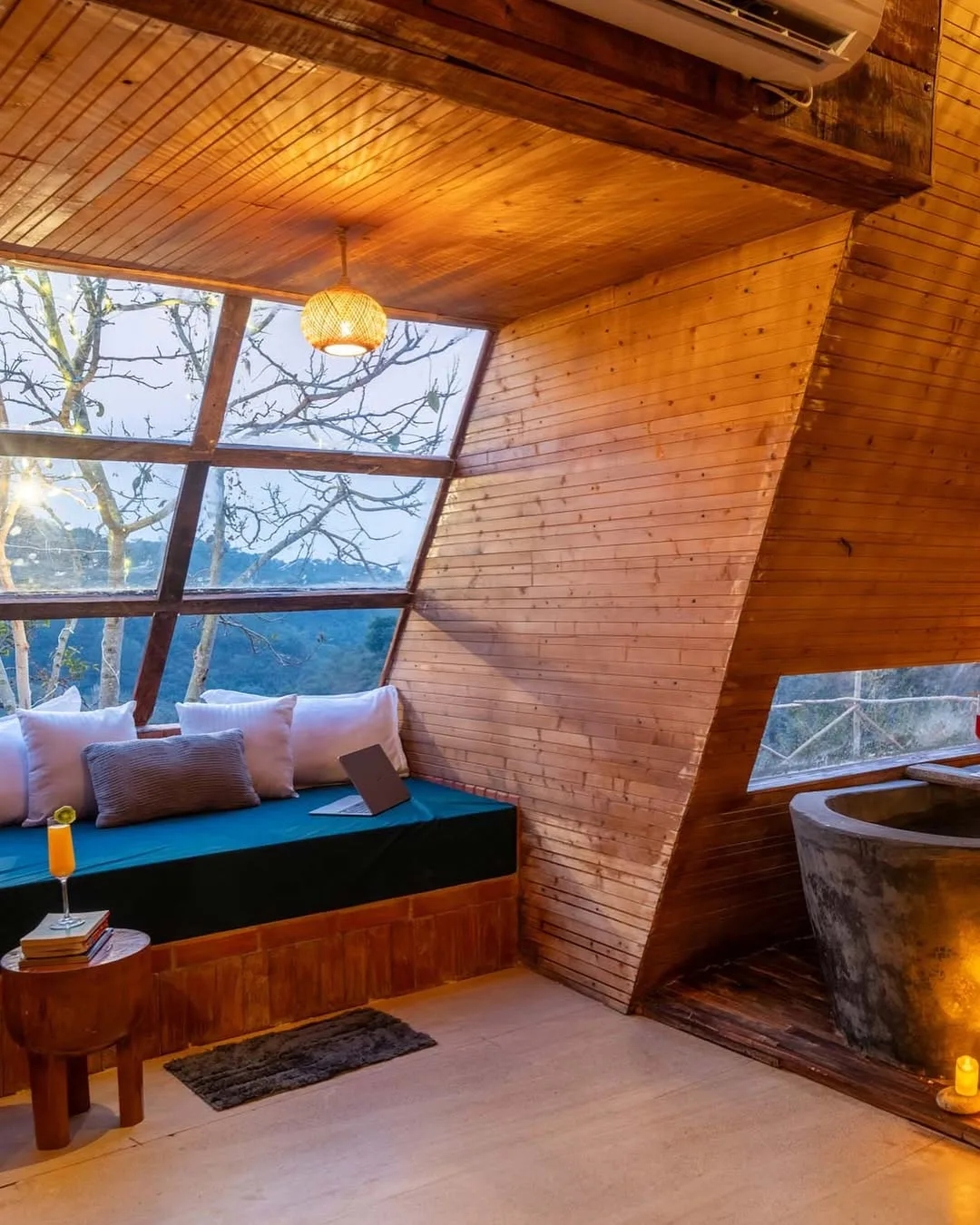 This stunning frame cabin offers a cozy attic bed, private machan with breathtaking views, a luxurious hot bathtub, a peaceful reading corner, and a comfortable sofa-cum-bed.