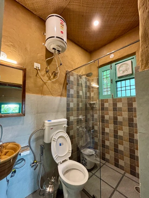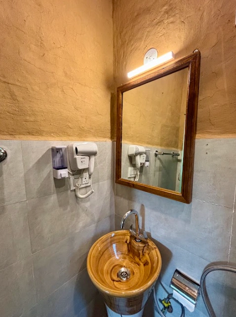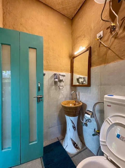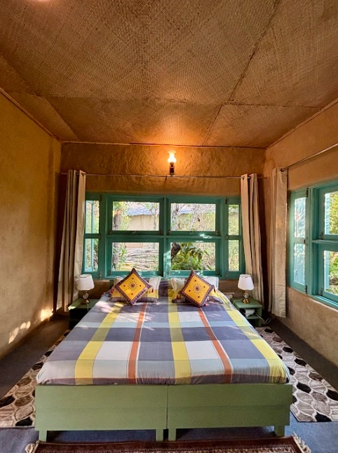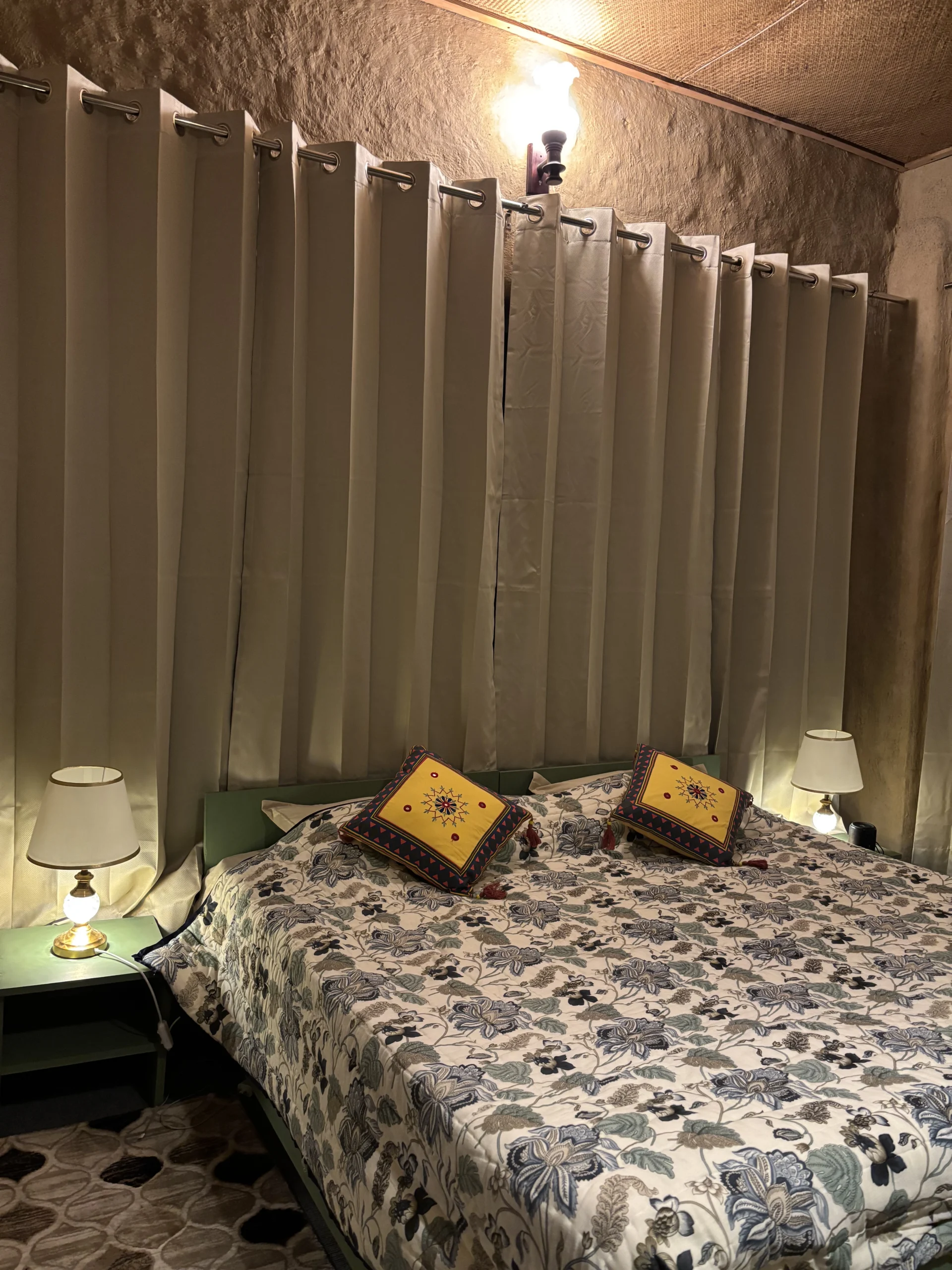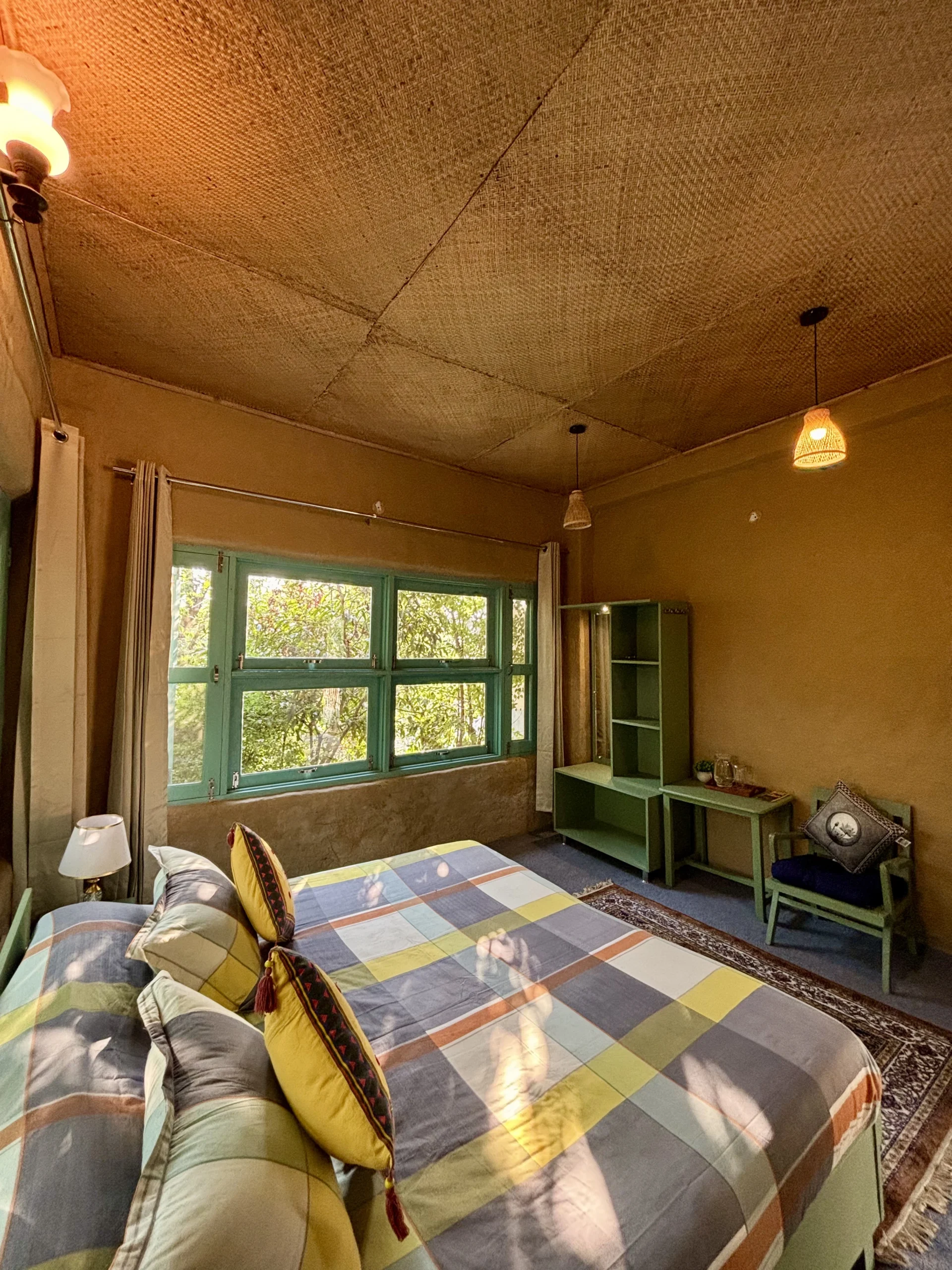 Rustic elegance meets cozy comfort in this thoughtfully designed room, featuring local art, soft lighting, and peaceful surroundings.