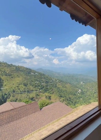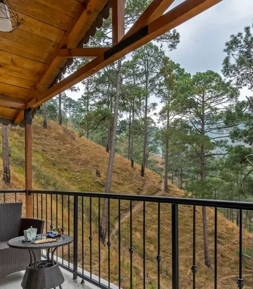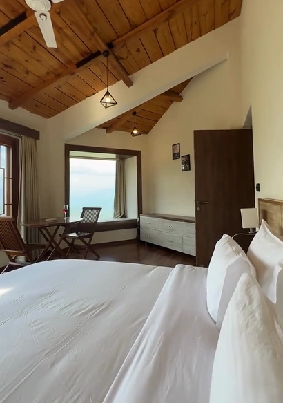 With large windows and a private balcony, this room brings the beauty of the outdoors inside. Enjoy plush bedding, warm interiors, and access to shared villa amenities like the garden and outdoor seating.
