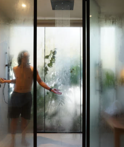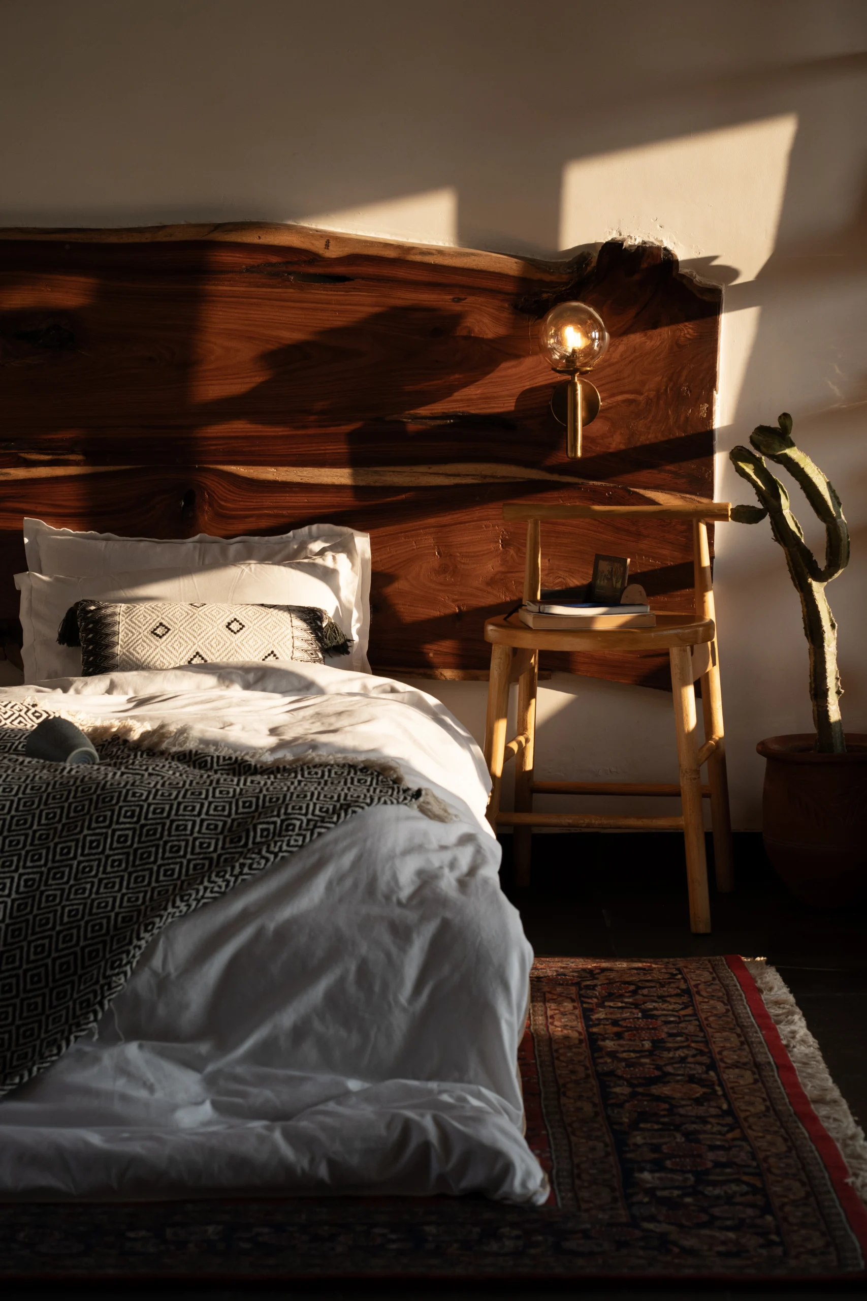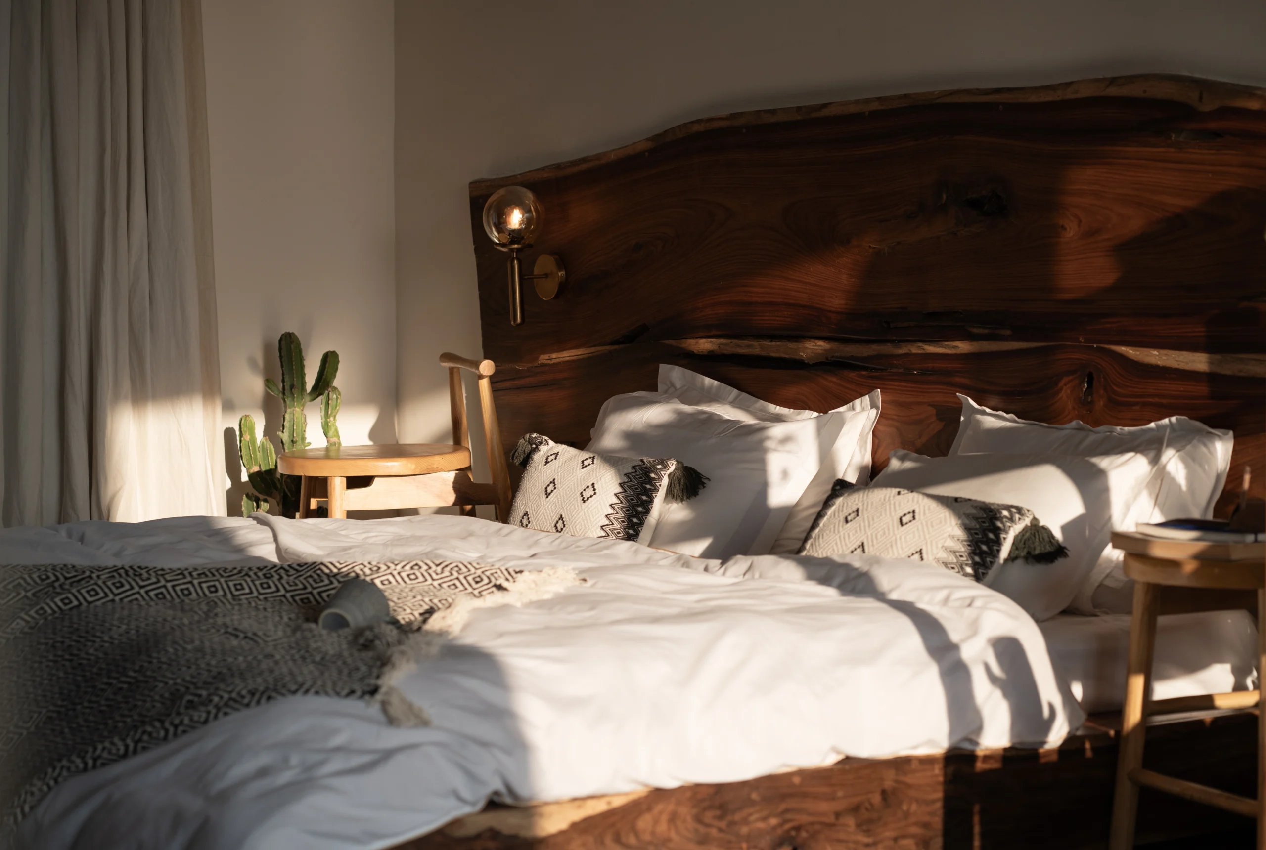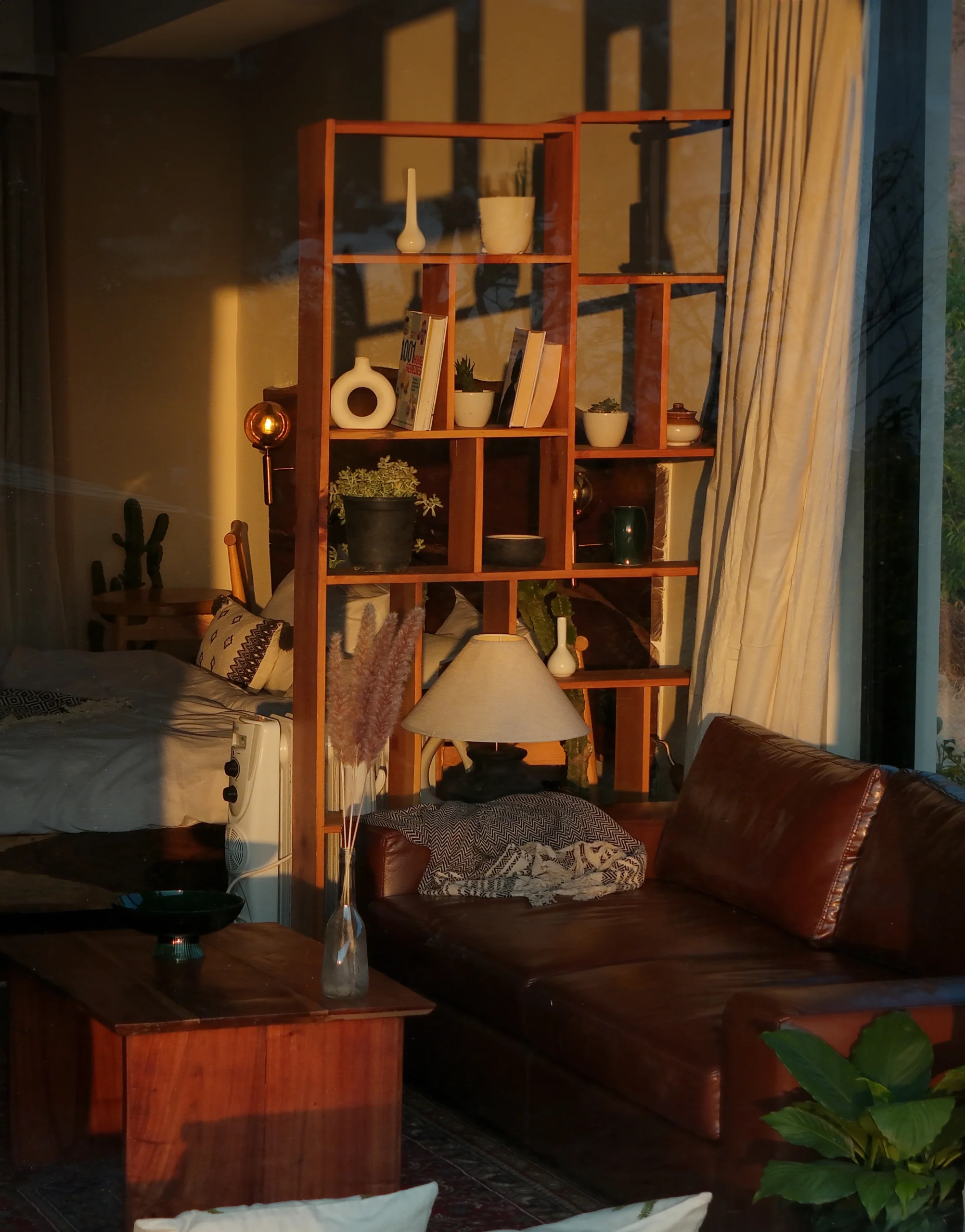 Biophilic room with modern Scandinavian interiors, warm lighting, and a floor-to-ceiling window that opens to a cosy balcony—perfect for tranquil views and restful stays.