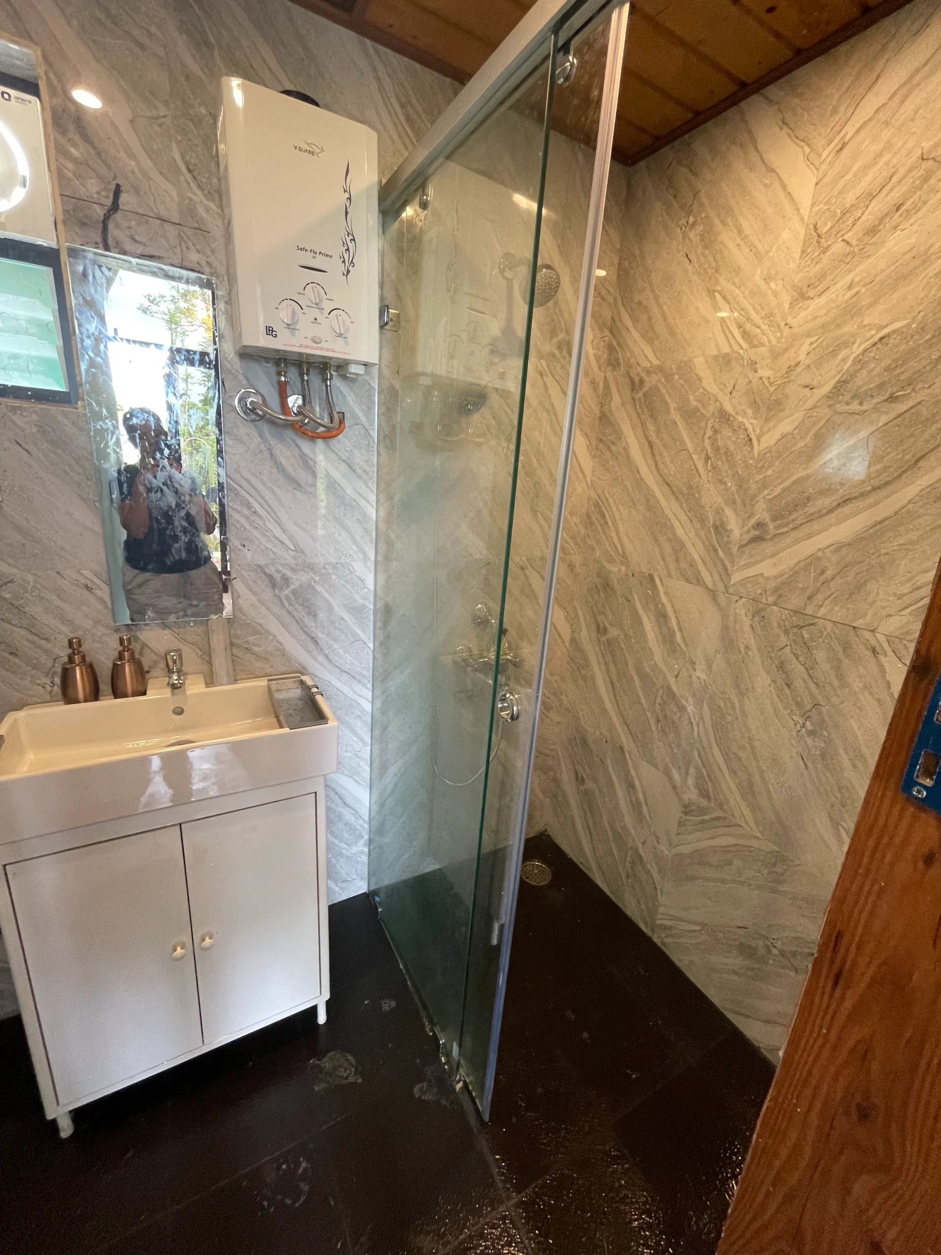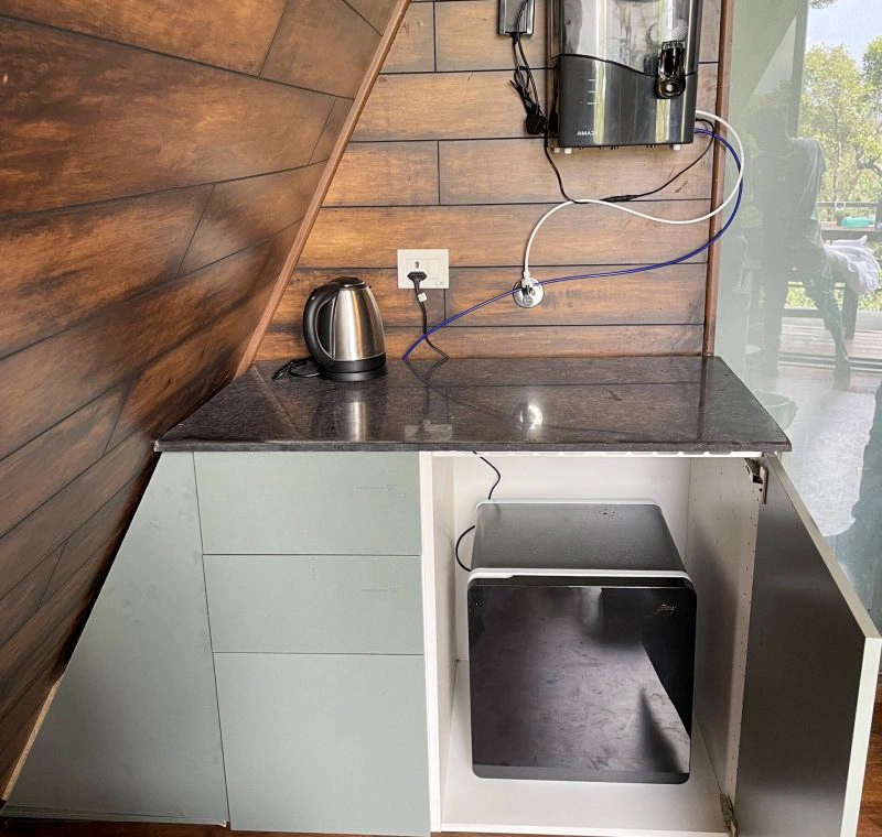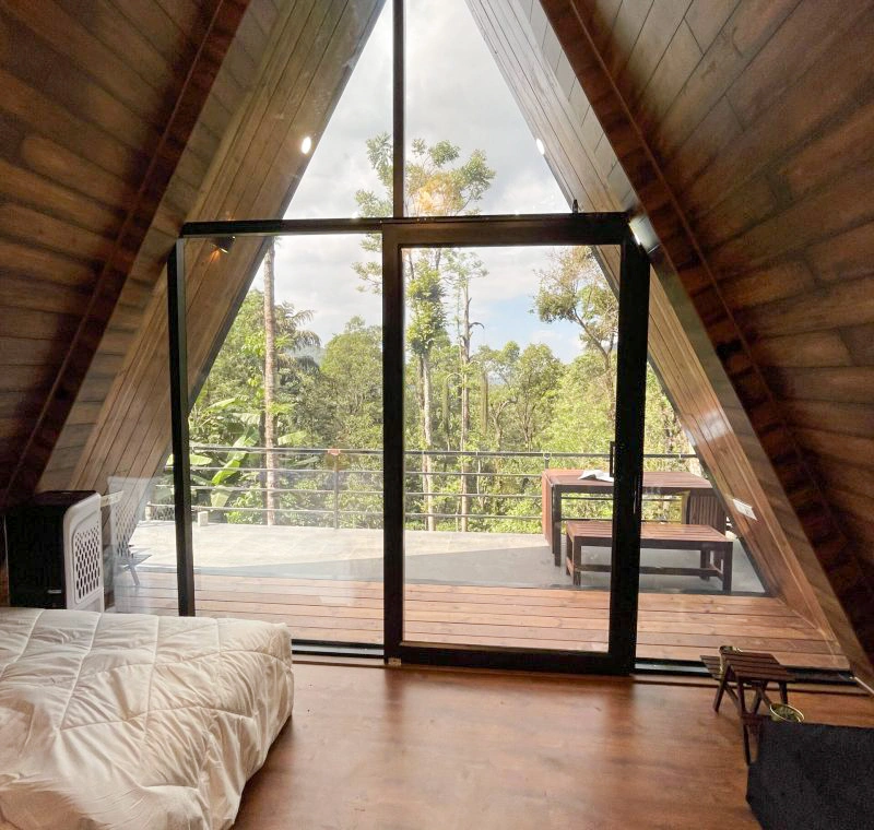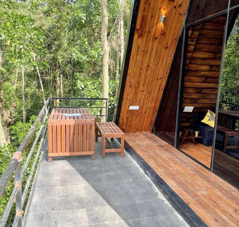 A cozy chalet-style cabin nestled in nature, featuring wooden interiors, sloping roofs, and large windows that frame the hills; perfect for a peaceful Chikmagalur getaway
