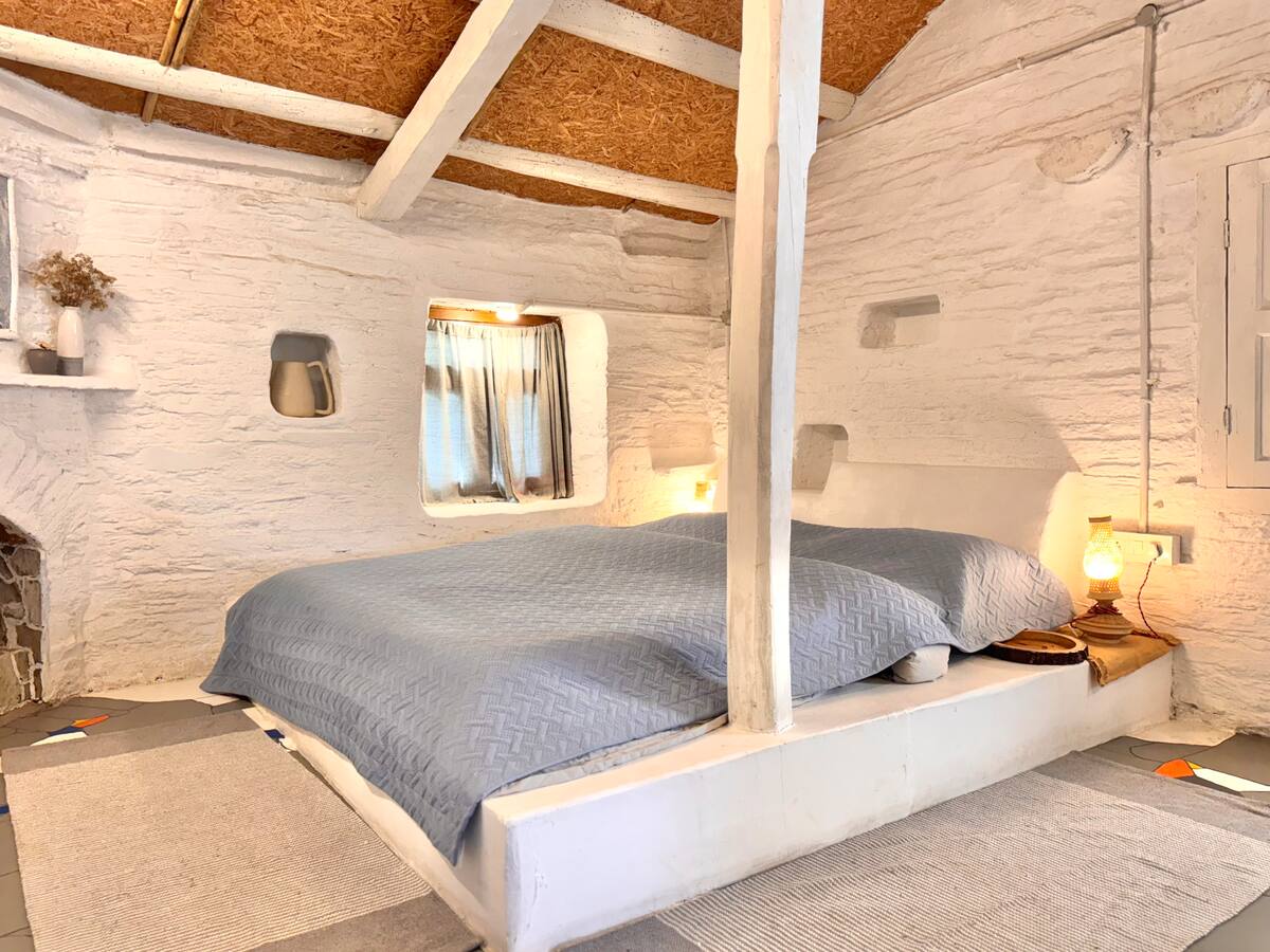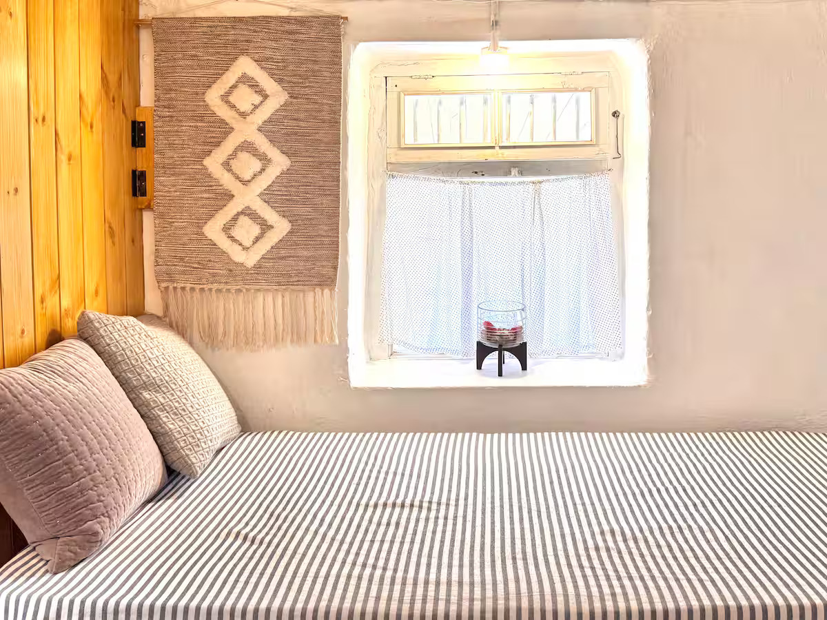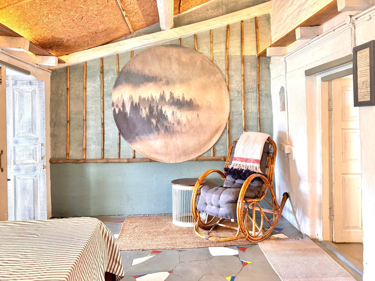 Sabi is restored stone suite with a bedroom, study and sleeps 3 comfortably. Hand-painted floors and hillside views make it a serene getaway.