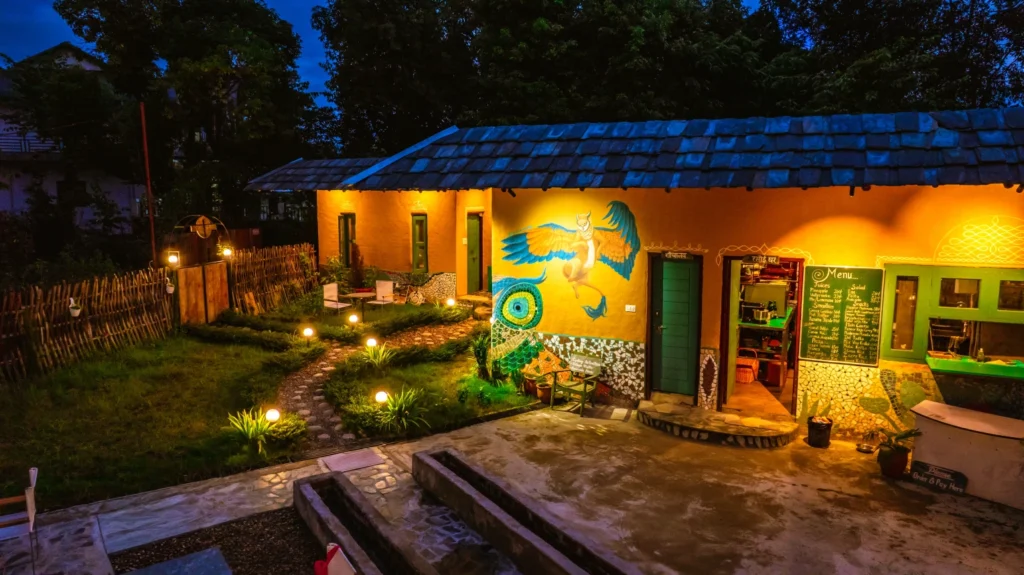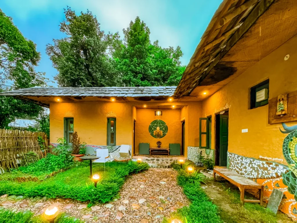Tucked away in the artist’s village of Andretta, Jaadooghar Madcap Mudhouse is a peaceful retreat set against the scenic backdrop of Himachal Pradesh’s Kangra Valley. This one-of-a-kind mudhouse property is built using traditional materials like mud, brick, and wood, embracing the natural elements while offering a warm, rustic charm. The two rooms are thoughtfully designed to reflect simplicity and serenity—spaces that invite you to slow down, breathe deeply, and immerse yourself in the soothing rhythm of village life. Surrounded by pine trees, open skies, and the whispers of the hills, this is where nature and creativity quietly come alive.